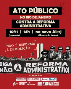 Amanhã, quarta-feira, dia 29, a partir das 14h, em frente à nova sede da ALERJ (Edifício Lúcio Costa, antigo prédio do BEG, Rua da Ajuda, nº 5, Estação Largo da Carioca do Metrô - Centro),  irá ocorrer Ato Contra a Reforma Administrativa (que também irá acontecer em Brasília e em muitas outras cidades do país)   Ponto de encontro do grupo do Sinal-RJ: Edifício Sede do BCB no Rio de Janeiro (Av. Presidente Vargas, 730 - Centro).