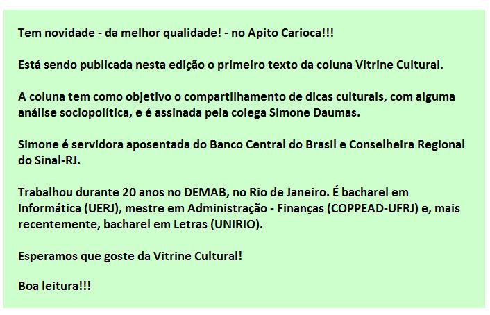 VITRINE CULTURAL TEM NOVIDADE NO APITO CARIOCA: VITRINE CULTURAL, DA COLEGA SIMONE DAUMAS